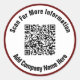Você pode substituir o URL do site do seu código QR. Há duas linhas de texto de exibição em preto que você pode editar para mostrar uma mensagem personalizada. Estes autocolantes têm texto preto num círculo branco. A borda é vermelha escura.