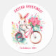 Celebre os feriados Páscoas enfeitando este adesivo de "Saudações Páscoas"! Uma representação de aquarela fofa do coelho da Páscoa cavalgando rosas rosa de carregando de bicicleta. Personalize seu texto por baixo da imagem.