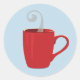 Uma caneca de café vermelha e brilhante cheia de café ou chá favoritos. Use como selo de envelope ou adesivo em seus itens e presentes favoritos. As cores incluem vermelho, cinza e azul.