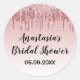 Adesivo redondo personalizado para um chá de panela. Este adesivo apresenta um elegante escrevendo preto e uma rosa rosa pincelada pingando cor-de-rosa pincelada fundo brilhante. Você pode personalizá-lo com seu nome e data de chá de panela. Você pode até alterar a cor do texto e o estilo da fonte usando a opção personalizar.