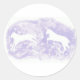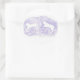 Este adesivo redondo mostra dois cavalos brancos pulando sobre um fundo de lavanda.