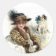 Uma cena elegante com uma moça elegante com um chapéu elegante e casaco de pele. Ela está sentada com seu pequeno cachorro.