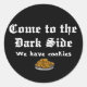 Este adesivo cômico diz "Venha para o Lado Escuro - Nós temos biscoitos" em duas fontes de rico. Logo abaixo do texto está um prato de biscoitos para ilustrar os biscoitos oferecidos para entrar no lado negro.
