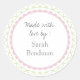 Aqui estão alguns adesivos de chic cor-de-rosa e verde que você pode usar em sua própria mão em itens feitos. Sejam as suas receitas, doces, bolos, doces, compotas, espadas, conservantes, ou talvez para os vossos projetos de roupa ou artesanatos, cozidos em casa? Certifique-se de avisar a todos que você fez isso com suas próprias mãos... pessoas amam coisas feitas por mão porque há muito mais amor neles!! Para personalizar esses adesivos.. você pode digitar o nome que quer impresso ou remover o nome e deixá-lo vazio para que possa escrever seu nome nos adesivos para adicionar um toque ainda mais pessoal feito à mão!!. Outras cores e estilos disponíveis na minha loja zazzle. .