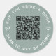 Junte algumas bebidas grátis para a noiva na festa de solteira ou no fim de semana de solteira com estes autocolantes personalizados de código QR em verde-sábio. O design apresenta duas linhas de texto personalizado (mostradas com "comprar a noiva uma bebida" e "digitalizar para pagar pela Venmo") em letras brancas, com um código QR personalizável no centro. Adicione o link ao seu serviço de pagamento ou aplicativo preferido, e o código QR será atualizado para que os colegas (ou admiradores) possam fazer a varredura para pagar!
