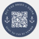 Reúna algumas bebidas grátis para a noiva em sua despedida de solteira ou fim de semana de despedida de solteira com esses adesivos de código QR personalizados em azul naval e branco. O design apresenta duas linhas de texto personalizado (mostrado com "compre uma bebida para a noiva" e "escaneie para pagar pelo Venmo") em letras brancas, com um código QR personalizável no centro, acentuado por duas ilustrações de âncoras de navios encimadas por corações. Adicione o link ao seu serviço ou aplicativo de pagamento preferido, e o código QR será atualizado para que os outros participantes da festa (ou admiradores) possam escanear para pagar!