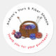 Redondos de autocolantes de "obrigado" com um tema de tricô. Um cesto de fios, bolas de fios com agulhas para tricotar, é a imagem no centro dos autocolantes brancos que vêm em dois tamanhos. Personalize o texto que se curva em volta de cima e de baixo com o nome do compro e o texto "obrigado você para a sua compra".