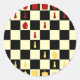 Um impressão colorido de um tabuleiro de xadrez configurado para mostrar alguns movimentos de abertura. O conselho é creme e preto, com peças de xadrez de estilo tradicional em vermelho e marfim.