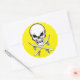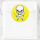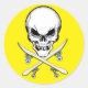 Adesivo redondo com crânio e ossos cruzados - com os ossos convertidos em pranchas - para uma reviravolta única e icônica, contra um fundo amarelo brilhante. Colete todos eles.