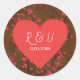 Os adesivos perfeitos para as suas necessidades de embalagem, este item apresenta um fundo de padrão cardíaco castanho e vermelho com um coração vermelho brilhante no centro. As iniciais do casal estão no centro com a data do casamento embaixo. Escolha entre várias formas. Personalize o seu hoje! Trabalho de arte: AMBilustrações http://www.etsy.com/shop/AMBillustrations/