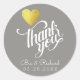 Design romântico de um coração amarelo-ouro falso com a palavra 'obrigado você', em simples etiqueta simples e cinza, personalizada com seus nomes e data especial (dia do casamento)
