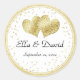 Elegante e Dourada Vedação de Coração, desenhada com corações dourados e confete em fundo branco. O texto inclui: Nomes das noivas e do noivo e data de casamento. Para personalizar, basta inserir o texto no nosso modelo, substituindo a amostra. Certifique-se de ver todas as peças desta Coleção Elegante Dourada de Corações de Casamento para cartas e acessórios correspondentes.