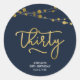Este elegante adesivo aniversário de 30 anos redondo apresenta cordas de luzes e a palavra "Trinta" em ouro falso contra fundo azul escuro. Veja outros itens correspondentes aqui https://www.zazzle.com/collections/strings_of_lights_faux_gold_celebration_collection-119311942951401241?rf=238364477188679314 Personalize-o com seus detalhes substituindo o texto do marcador de posição. Para obter mais opções, clique no botão "Personalizar". *Observe que a Marca d'água do Zazzle que aparece na visualização de zoom NÃO aparecerá no produto impresso final. © Rosewood e Citrus