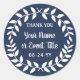 Adicione um toque final personalizado aos brindes de festa e bilhetes de agradecimento com adesivos redondos personalizados de coroa de louros. Todo o texto neste modelo é simples de personalizar para qualquer ocasião, como casamento, chá de noiva, formatura, festa de aniversário, aniversário de casamento ou aposentadoria. Altere ou exclua qualquer um dos textos para criar selos de envelope para convites, anúncios ou save the dates. O design botânico moderno em azul marinho e branco apresenta uma coroa de louros branca, caligrafia rústica e tipografia clássica elegante. Esses rótulos redondos elegantes adicionam um toque único e personalizado à celebração de um dia especial.