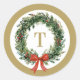 Um design de adesivo de Natal redondo elegante e atemporal com uma coroa de sempre-verde pintada à mão com uma fita vermelha e monograma personalizável em dourado. Edite facilmente o monograma com a inicial do seu sobrenome.