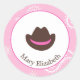 Os adesivos cor-de-rosa que fazem um selo festivo para bolsas doces ou que usam os adesivos maiores na frente das bolsas. Este adesivo tem um fundo cor-de-rosa de bandana com um chapéu castanho de vaqueiro com uma banda rosa. Personalize com o nome das garotas da festa.