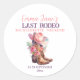 Um lindo adesivo de Cowgirl Last Rodeo despedida de solteira com botas de cowgirl, flores e chapéu de cowgirl rosa. Um ótimo design para uma festa de despedida de solteira com tema western, chá de noiva. O texto em rosa claro e roxo pode ser alterado para personalizar os detalhes da sua festa e personalizar com seu nome e datas.