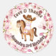 Cute little cowgirl saddle up birthday personalized thank you stickers. Cowgirl riding cute baby horse and pink flowers. Brown and pink yellow farm colors.