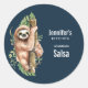 Etiquetas de cozinha - desenhadas com um design de aquarela giro com uma preguiça aguda pendurada num galho arbóreo rodeado por folhas tropicais verdes. Fundo azul escuro.