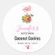 Etiquetas de cozinha - diz "feito com amor" com 3 pequenos corações vermelhos. Projetado com uma ilustração digital fofinha apresentando um flamingo rosa com uma perna erguida. Em pé sobre um buquê de flores e folhas de hibisco tropicais. Uma borboleta bonito está pairando ao redor das flores.