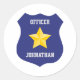 Este adesivo personalizado apresenta um crachá de policial azul com um nome personalizado impresso na parte inferior. O fundo do crachá é um marinho azul com uma estrela dourada colocada no centro. O título "Oficial" é impresso na parte superior com um nome de exemplo impresso na parte inferior. você pode personalizar o adesivo com seu próprio nome ou texto personalizado.