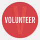 Crachá Red Volunteer com título em branco negrito sans serif com monograma vermelho claro em fundo vermelho.