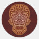 Um elaborado dia do design do crânio de açúcar morto, decorado com intrincados espirais e padrões de pontos. As linhas e círculos complexos são coloridos com um marrom-claro que é destacado para criar um brilho sutil na superfície. O interior do crânio é terminado com um marrom avermelhado que se repete no fundo criando um belo contraste. Uma sombra cai logo abaixo do fazer do crânio que parece flutuar logo acima da superfície do adesivo. Esta na moda é uma representação impressionante deste símbolo do Dia dos Mortos.