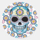 O crânio de açúcar desenhado em tons de azul e rosa é rodeado por flores e corações coloridos.