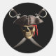 Crânio pirata, mancha de olho, chapéu pirata e duas espadas cruzadas para um clássico Jolly Roger.