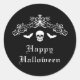 Celebre o Dia das Bruxas com este adesivo preto e branco! Apresentando uma silhueta de crânio impressionante, morcegos voadores e um florescimento decorativo com a mensagem festiva de Feliz Halloween, é perfeita para decorar cadernos, laptop, favoritos para festas ou qualquer superfície que possa usar um toque de estilo assustador.
