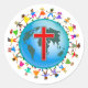 Ótima ilustração de um grupo de meninos e meninas diferentes que dão as mãos em um globo do mundo e uma cruz vermelha representando a fé no Cristo. Personalize e escolha facilmente a sua própria cor de fundo. Imagem disponível em vários presentes e produtos.