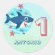 Um ano / qualquer garoto de idade aniversário oceano bebê azul presente embrulho ou selo um adesivo de favor engraçado engraçado com um pequeno tubarão nadando debaixo d'água com peixes e estrelas vermelhas. +++++++++++ Fácil de personalizar com o nome e a idade do seu filho.