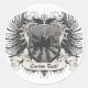 Presentes bonitos da heráldica da crista do cavaleiro com fundo da asa e os rolos elegantes! Cavaleiro a cavalo no centro do protetor! Edite o texto na bandeira, mude o estilo de pia batismal, a cor e o tamanho! Criar a crista perfeita pessoal ou da família editando o texto nestes presentes da heráldica da crista do cavaleiro!