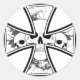 Esta Cruz de Ferro tem três crânios. Todos os três crânios são dentro da cruz de ferro. A Cruz de Ferro tem bordas alternadas de preto e branco. Este design é excelente para o entusiasta de motociclistas e motociclistas.