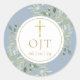 Com uma cruz de ouro, iniciais do monograma e data com delicadas folhas de aquarela em um fundo azul poeirento, este adesivo chique é perfeito para muitas ocasiões religiosas cristãs. Criado por Thisisnotme©