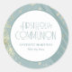 Facilite o planejamento de sua primeira comemoração da Comunidade com esta coleção de Modelo de DIY. Contém um convite, um envelope de coordenação e um rótulo de endereço de devolução. Você também encontrará sinais de boas-vindas, suprimentos de festas e um cartões de agradecimentos. Todo o texto pode ser editado. Procure itens na coleção Dusty Blue Dourado Arch. Este design botânico azul-abstrato e ouro é moderno, simples e sofisticado. O texto retrô vintage é clássico e, no entanto, muito atual. Este adesivo redondo contém a Primeira Comunhão Sagrada em letras grandes com o nome e a data do menino.