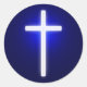 Um autocolante cristão único com uma cruz religiosa brilhante branca sobre fundo azul marinho.