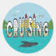 A design de cruzeiro utiliza a palavra "cruzeiro" para criar um navio de cruzeiro que navega para destinos exóticos estrangeiros através dos mares azuis. Inclui sol, âncora, funis a vapor e portholes de cabine para criar um gráfico divertido para fãs de férias de cruzeiro.