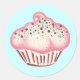 Um cupcake cor-de-rosa com aspersores num fundo verde da casa da moeda decora este adesivo. Estes autocolantes são excelentes para uma padaria, boutique, álbum, festa de aniversário, envelope, etc. A design é de uma ilustração original.