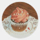 Cupcake de chocolate com glacé cor-de-rosa e aspersão em forma de coração num papel doidificado em tons castanhos e vermelhos.