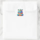 Round sticker is shown with a cute cupcake birthday blue monster print.
