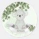Um design pessoal de bebê fofo. A design apresenta um coala com folhas de eucalipto O fundo é uma lavagem a aquarela verde. Mude facilmente o nome do seu próprio adesivo personalizado e fofo.