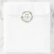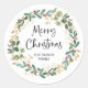 Estes autocolantes de férias simples e na moda apresentam uma coroa de aquarelas impressionante com folhas verdes e falsas de ouro e groselhas vermelhas, e uma tipografia moderna preta que diz "Feliz Natal" num fundo branco.