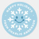 Round winter holiday greeting stickers featuring a cute, happy snowflake at the center. Around the snowflake are custom text in a bold, white font “Happy Holidays” and your name. Light blue background. All colors are customizable. You can change the greeting to "Merry Christmas” or any other short holiday greeting.