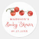 Add a fresh and charming finishing touch to your baby shower favors with this round cherry tomato sticker featuring hand-painted watercolor tomatoes on the vine. The design includes the mom-to-be's name, “Baby Shower” in a whimsical red script, and the shower date in a classic serif font. Perfect for sealing favor bags, decorating envelopes, or labeling party treats, this gender-neutral sticker complements summer, garden, or farmer’s market-themed baby showers with a playful yet elegant style. Personalize it to create a cohesive look guests will adore.
