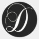 D monograma com fundo preto, script branco inicial e borda prateada. Um adesivo perfeito para os envelopes de casamento, sacos de presentes ou outra decoração para o seu casamento elegante.