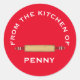 "Da Cozinha de" etiquetas de nome personalizadas. Design minimalista com fundo vermelho, pino rolante e texto branco em negrito sobre fundo vermelho. Cores de Natal. Todos os Direitos Reservados © 2021 Alan & Marcia Socolik.