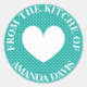 Da cozinha de adesivos com bolinhas azuis turquesas. O partido personalizado favorece nomes de etiqueta com mensagem personalizada. Design de polkadots elegantes com símbolo cardíaco e tipografia na moda. Adicione seu próprio nome e / ou sobrenome da família. Rótulos ou selos redondos para cozinhar feitos em casa e produtos de panificação como biscoitos, doces, bolo, cupcakes, guloseimas de Natal, etc.