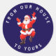 Este adesivo "da nossa casa à sua" apresenta um fundo azul marinho com papais noeis dançando e se divertindo. Para alterar o texto, clique no botão personalizar. Este design contém IA.