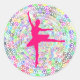 Design de dança pela paz com uma bailarina rosa quente no centro cercada por sinais de paz multicoloridos.